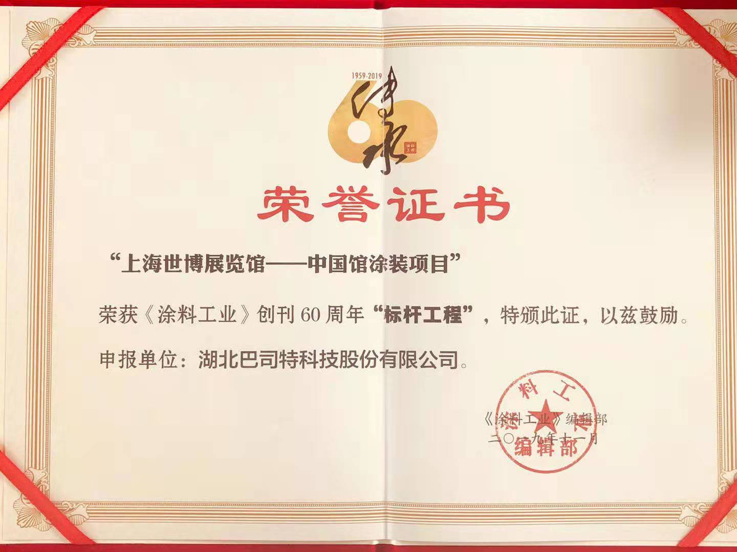 湖北巴司特科技股份有限公司憑借上海世博展覽館——中國館涂裝項目獲得“標桿工程”